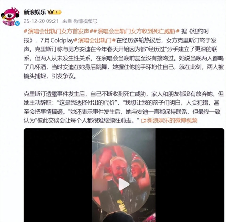 时间拉回2025年7月16日,美国波士顿酷玩乐队演唱会上的“Kiss Cam”互动环节,本该是活跃气氛的欢乐时刻,却意外成为克里斯汀的“人生灾难起点”。现场镜头扫到观众席时,捕捉到她与同公司CEO安迪·拜伦相拥依偎的画面,两人看到自己被投屏到大屏幕后,瞬间慌了神——安迪火速松手蹲下躲避,克里斯汀则捂脸转身,主唱克里斯·马汀还当场调侃“要么出轨要么太害羞”。这段视频被传到社交平台后,9小时内观看量就突破1200万次,全网瞬间炸锅。